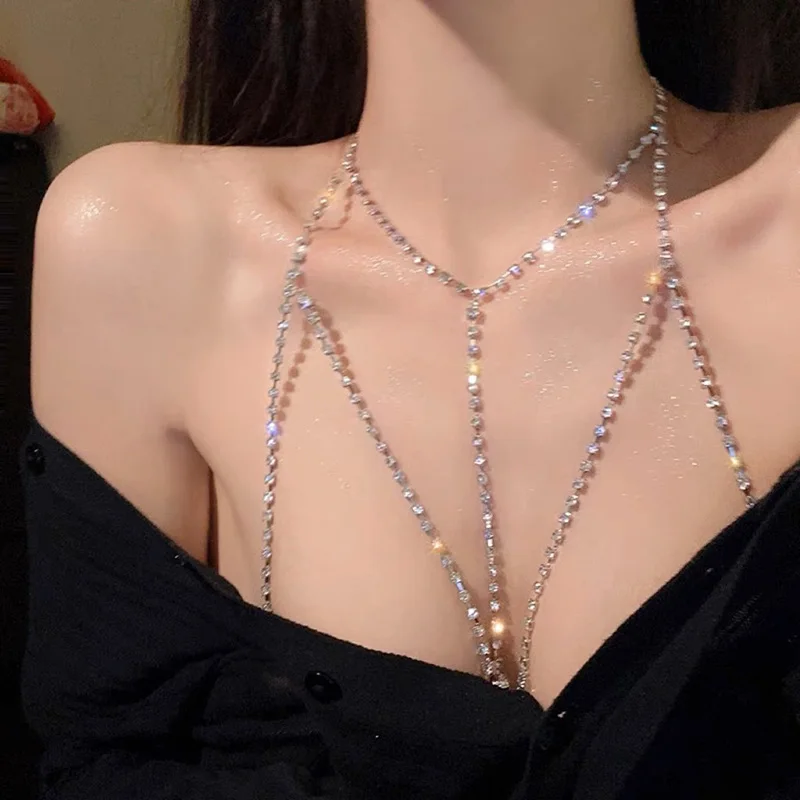 Shiny Rhinestones Tassel Sexy Chest Chain for Women Girls Fashion Metal Bra Cross Bikini Within Hollow Body Chain Jewelry