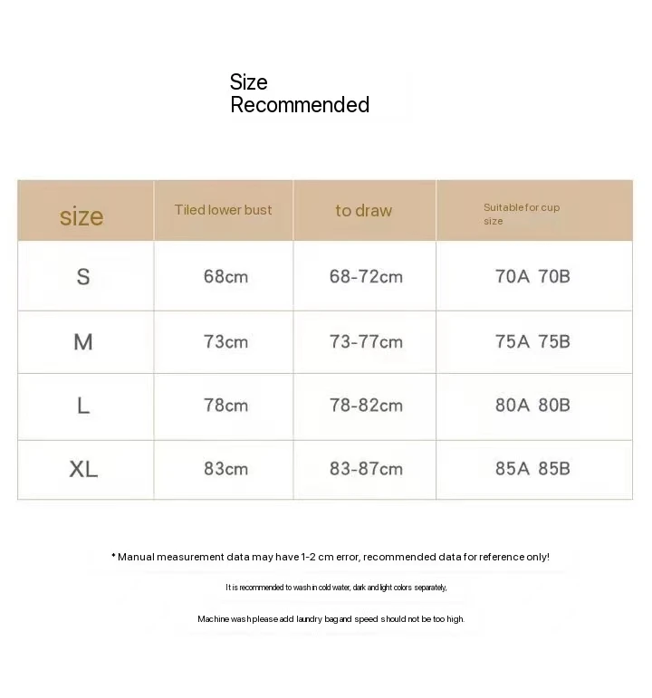Size:S(32-70ABC),M(34-75ABC),L(36-80ABC),XL(38-85ABC) Notes: 1.Please allow 1cm differences due to manual measurement, thanks. 2.Please understand because of the light irradiation or computer display difference, so I can't guarantee photos and real color is 100% the same. 3.Dear customer, If you have any questions about the product,you can contact me in time and we will solve it for you. We do our best to serve you!
